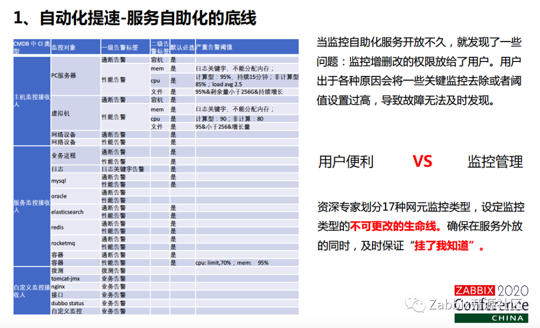 但是这个时候就带来了下一个问题,服务自动化的底线在哪里?因为我把这些服务都放出去之后,我们是属于运维团队的,运维是为公司的生命线做保障的,但是我们把有些自助服务放给了研发同学,这个时候不是黑他们。放给研发同学之后,研发同学就会觉得每天收的短信太多了,我们原本可能把CPU大于75,然后我就告警了,后来发现大于75也不一定每回都有事,那要不然我改改吧,我改成90,过两天我可能就改成95了,因为我总觉得它会没问题。这时候就出现我把自动化的服务权限放给所有人之后,我很难保证所有人的思想意识能高度统一,所有人都有责任心。有可能今天为了少收两条短信就把这个监控给我删掉了。这个时候出现故障了,老板不会去找他,老板只会找你,你这个监控平台怎么又没告警?