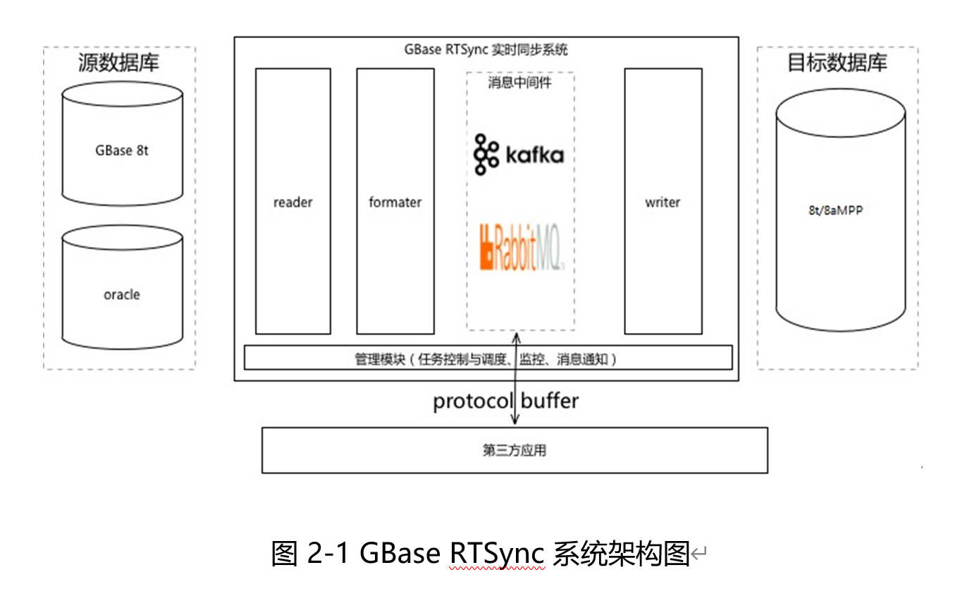 GBase RTSync 实时同步系统由四个子系统组件组成,分别是读数据组件、消息队列组件、写数据组件和管理组件 :