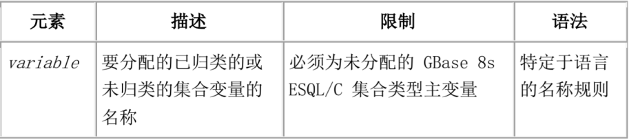 提示: ALLOCATE COLLECTION 语句仅为 GBase 8s ESQL/C 集合变量分配内存。要为 GBase 8s ESQL/C 行变量分配内存,请使用 ALLOCATE ROW 语句。