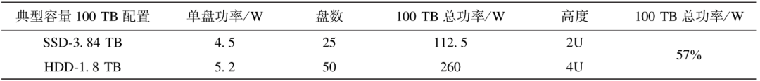 按照国家对数据中心PUE高标准建设要求,从数据中心IT设施的能耗占比维度看,数据存储设施的占比大约在35%,成为双碳目标达成的主要矛盾之一。数据存储有83%的能耗来自于存储介质,目前主流的存储介质主要包括HDD机械磁盘介质和基于SSD的半导体闪存介质。在全负荷情况下,SSD固态硬盘功耗基本小于3 W,而HDD磁盘功耗基本大于6 W。在静态无负荷情况下,SSD的功耗约0.05~1.3 W,但是机械磁盘功耗基本大于4 W。可见,HDD机械硬盘的能耗大于SSD盘。在相同容量下,固态盘相比机械硬盘的能耗降低70%,空间占用节省50%。