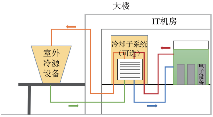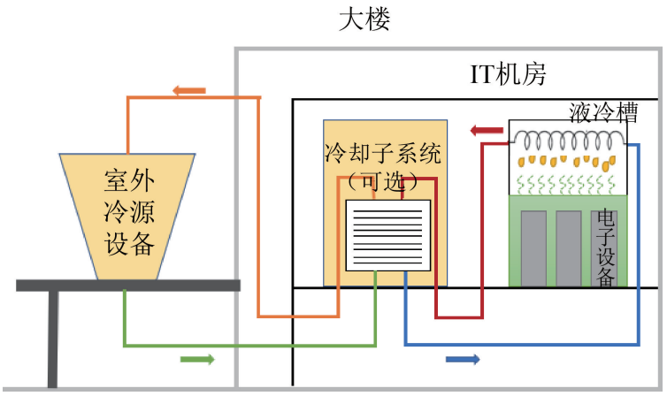 数据中心是支撑现代经济社会发展的战略资源和新型基础设施,用于收集、存储、处理和分发大量数据。随着人工智能、虚拟现实、智慧城市等高密度业务应用的逐步发展,数据中心所需应对的计算量和计算复杂度迅速增长。在芯片制程提升速度变慢的限制下,为了满足更快更难的处理要求,计算行业不得不通过“堆料”方式提升芯片能力,CPU功率已从单个150 W增加到300 W以上,用于图形处理单元的GPU单个功率甚至超过700 W。对于信息通信设备而言,运行温度是严重影响其工作性能稳定的重要因素,数据中心散热必须随着密度升高得到有效解决[1]。根据冷却原理不同,目前的冷却解决方案可以分为气体冷却(风冷)和液体冷却两大类。由于风冷散热架构下数据中心机架的最大功率在20~30 kW,而直接液体冷却可以将每个机架的功率限制提高到100 kW以上,因此在越来越多的热负荷高、建筑面积有限、节能要求高的场景下,只能寻求液体冷却解决方案。
