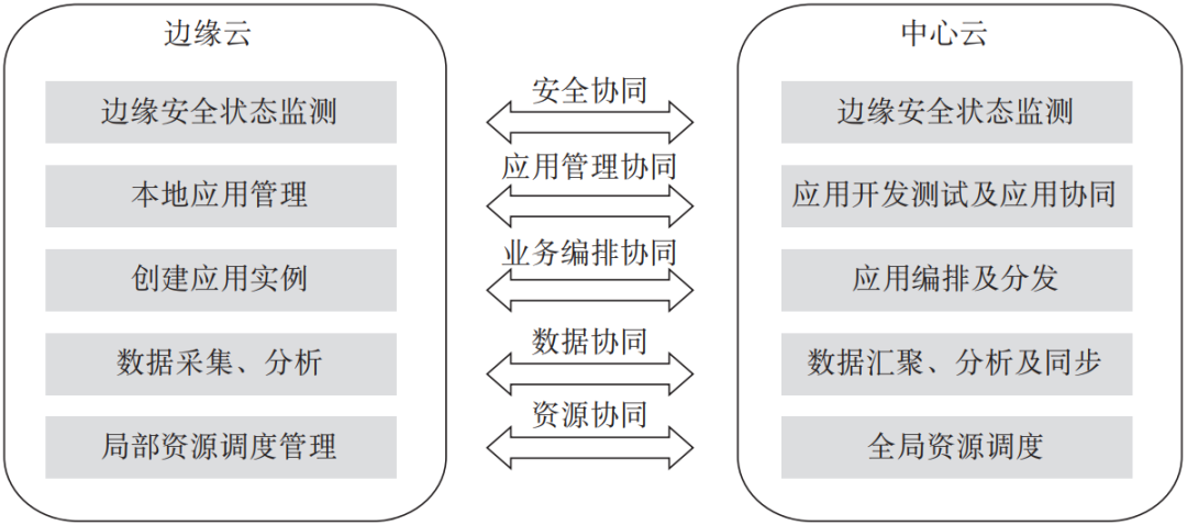 云边协同是指中心云和边缘云的协同发展,云边协同既包含底层算力设施的资源协同,同时也包含上层的数据协同、业务能力协同及安全协同等[4-5](见图1)。其中,资源协同是指边缘算力设施既可对本地算力资源进行调度管理,也可以接受云端算力设施的资源调度和管理。数据协同一方面依托边缘算力设施实现对终端数据的快速采集、初步处理、分析和响应,满足终端设备数据处理及时性需求,另一方面通过将数据上传到中心云,实现了对海量终端数据的云存储,弥补了边缘算力设施存储能力不足的缺陷。业务编排协同主要面向微服务应用场景实现应用在边缘节点的快速部署,在边缘节点创造应用实例,在云节点实现应用分发、编排,提升边缘应用的部署效率。应用管理协同是指边缘节点提供应用部署环境,并实现对本地应用的生命周期管理,云节点负责应用开发和测试,同时对边缘节点应用的生命周期进行管理。安全协同是指边缘节点和云节点在安全防护方面保持协调联动,边缘节点可提供部分安全策略,云节点可对边缘节点的安全状态进行监测,并对边缘节点提供更为完善的安全防护[6]。