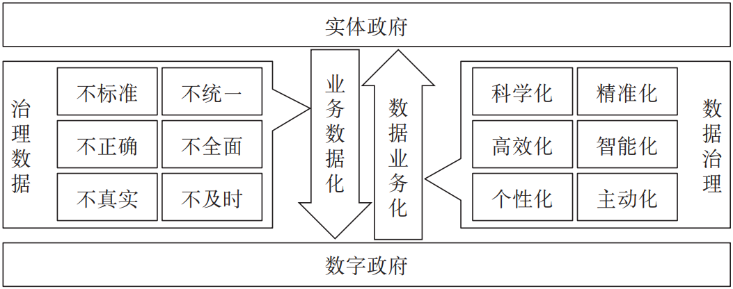 业务数据化阶段,信息化系统的建设优化了业务模式,同时为数字政府建设沉淀了大量数据、打下了数据基础,但也出现很多问题数据,包括数据不标准、不统一、不正确、不全面、不真实、不及时等,导致无法很好地支持数据创新应用。为了提升数据质量、保障数据安全,需要对数据做检测检验、清洗加工、脱敏脱密、分级分层、分析挖掘等操作,这些操作是治理数据的过程。在数据业务化阶段,需要对沉淀和积累的政府数据进行深层次的整合、分析、加工、利用、创新,推动流程再造、创新业务形态、赋能数字生态,实现政府决策、社会治理、公共服务、数字经济的科学化、智能化、精准化、高效化、个性化、主动化提升,这一过程是基于对政府数据的运用,也是对政府治理能力的建设与提升。总体来说,政府数据治理有两层内涵:对政府数据的治理和利用数据提升政府治理能力(见图1)。