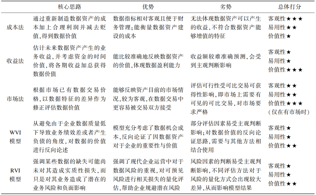 通过相关法律、规章及行业标准等文件,对当前数据资产估值尚无权威统一的法律准则或方法体系。从学术研究及各行业实践案例来看,当前数据资产估值方法总体可分为货币度量方法及非货币度量方法两类。货币度量方法以传统资产评估方法为代表,主要包括成本法、收益法以及市场法三大类,此外还包括浪费价值、风险价值等创新货币评估模型,从数据缺失可能带来的资源浪费和风险规避等角度,反向论证数据资产在企业中的价值。货币度量方法的评估结果能够直接与其他货币价值相比较,从而带来直观的价值体现,但总体实操难度较大,此类方法在国内外企业中几乎无成功实践案例。非货币度量的方法能够在一定程度上反映数据资产自身的价值变化情况,满足对数据资产的管理目的,但由于缺乏量纲的先天缺陷,在可比性方面较为不足,且难以为数据要素的流通交易提供参考。