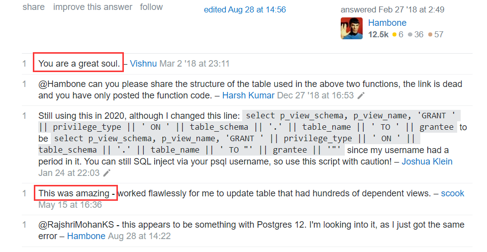 这种情况就得通过我们之前的方法来实现,把删除视图、修改字段、创建视图放到一个事务下执行,但是如果嵌套的视图比较多就很麻烦。为了克服这个麻烦,就有一个大神级人物写了两个函数来轻松实现了这个问题。由于太多人受到这个“烦恼”问题的困扰,作者得到了极高的赞扬。