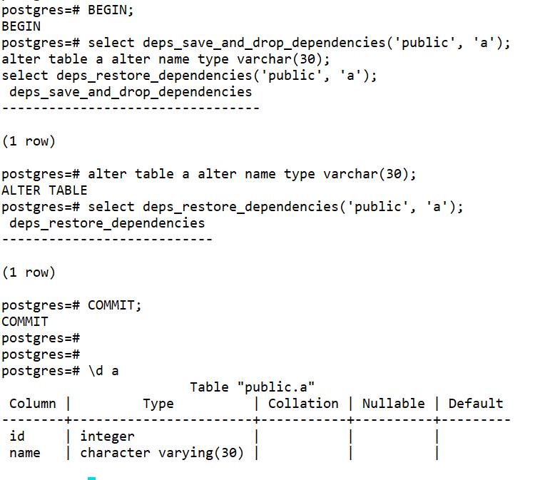 BEGIN; select deps_save_and_drop_dependencies('public', 'a'); alter table a alter name type varchar(30); select deps_restore_dependencies('public', 'a'); COMMIT |