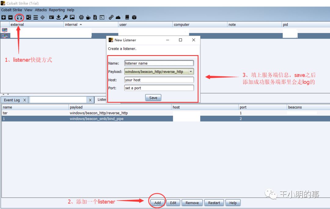 对于cs的teamserver配置环节有很多文章介绍,这里我不再赘述。服务端启动完成之后,首先要设置一个listener,类型的选择看环境情况和个人习惯。因为目标环境简单(我也比较懒),我设置的常规http的reverse类型。