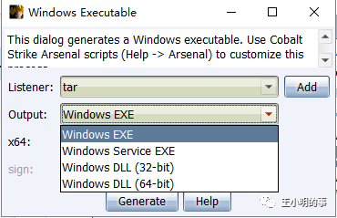 “listener”选择创建好的监听器,“output”选择要创建的payload类型。其中“Windows EXE”与“Windows service EXE”的区别是前者只是简单的一个独立payload,exit之后不会重新上线,但是service这个需要且只能使用系统命令 sc create创建一个系统服务,服务创建成功之后重启还会上线,其中区别接近rat的绿色版和安装版的区别(service问题请教于vexs师傅)。因为这里只是利用该机器对内网进行渗透,所以选择“Windows EXE”。
