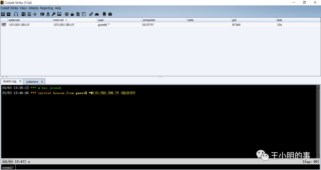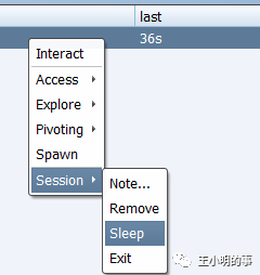 在正式操作之前需要注意一个细节,“last”一栏是靶机与我们的teamserver最后通信的时间间隔,3.x默认的sleep时间间隔是60s(此处不太确定是不是默认,我的都是这样的),就是一分钟。可能设计初衷是为了通信隐蔽考虑,对于持久化控制来说这个设置确实也很合理。但是我们在对机器进行操作时就需要自己去修改这个休眠时间了,不然你的每一步操作都需要等待一分钟才能得到结果。(一开始我以为是网络延迟之类的,被逼疯。)