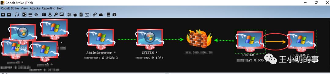 因为listener的使用不同,pivot graph界面(就是那个三个点的界面)也会给予不同的展示方式,smb方式的通信是橙色的箭头。