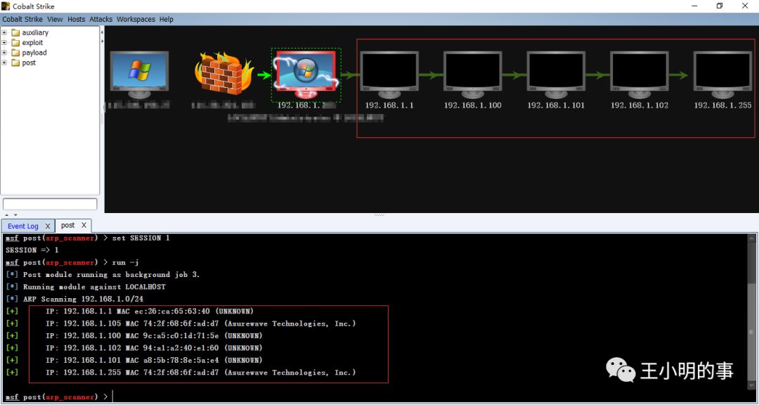 4、cs2.5 的arpscan除了mac地址可以出详细的机器厂家型号等,发现的与跳板机相连系的机器也会列在pivot graph图形界面上(下图是我拿自己电脑演示的)。记得当时的内网使用cs2.5扫完还发现不少天朝出口的机器(下下图)。