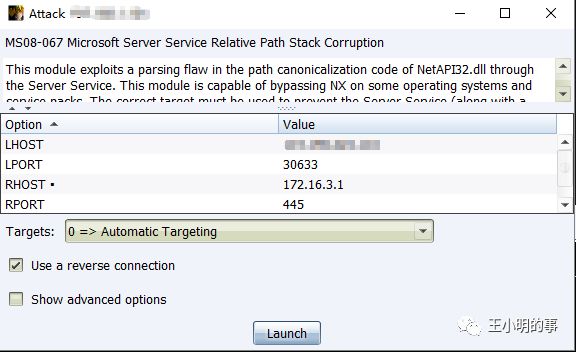 双击ms08067的模块进入设置页面,图形化设置msf的参数,点击launch攻击成功的话会话就弹回来了。
