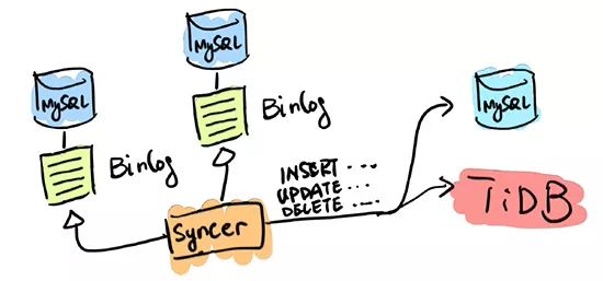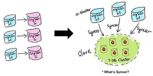 TiDB 应用的第一类场景是 MySQL 的分片与合并。对于已经在用 MySQL 的业务,分库、分表、分片、中间件是常用手段,随着分片的增多,跨分片查询是一大难题。TiDB 在业务层兼容 MySQL 的访问协议,PingCAP 做了一个数据同步的工具——Syncer,它可以把 TiDB 作为一个 MySQL Slave,将 TiDB 作为现有数据库的从库接在主 MySQL 库的后方,在这一层将数据打通,可以直接进行复杂的跨库、跨表、跨业务的实时 SQL 查询。黄东旭提到,“过去的数据库都是一主多从,有了 TiDB 以后,可以反过来做到多主一从。”