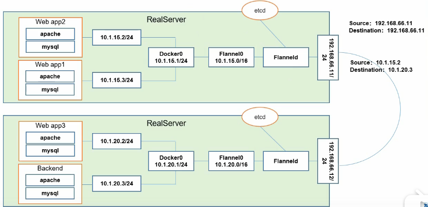 建立一个覆盖网络(overlay network),通过这个覆盖网络,将数据包原封不动的传递到目标容器Flannel使用etcd存放网络配置、已分配的subnet、host的IP等信息