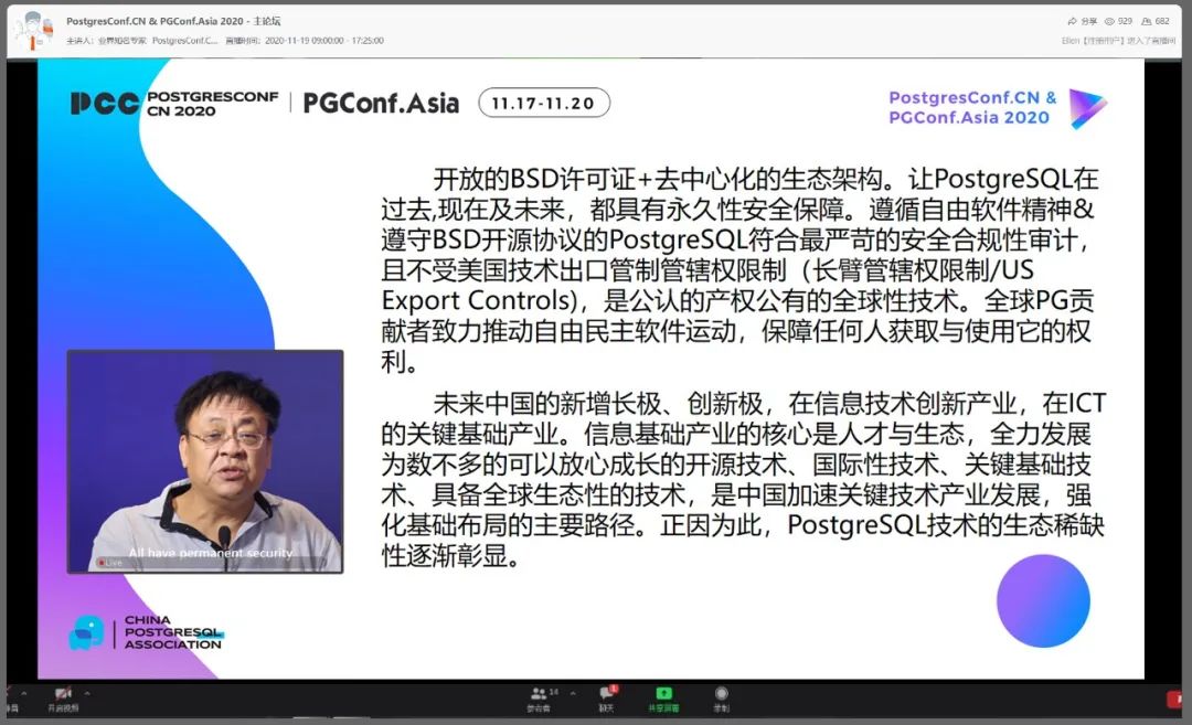 中国开源软件推进联盟常务副主席,中科院软件所研究员刘澎代表COPU致辞。他在致辞报告中指出,基于开放的BSD许可证+去中心化的生态架构,让PostgreSQL在过去,现在及未来,都具有永久性安全保障。遵循自由软件精神&遵守BSD开源协议的PostgreSQL符合最严苛的安全合规性审计,且不受美国技术出口管制管辖权限制(长臂管辖权限制/US Export Controls),是公认的产权公有的全球性技术。全球PG贡献者致力推动自由民主软件运动,保障任何人获取与使用它的权利。