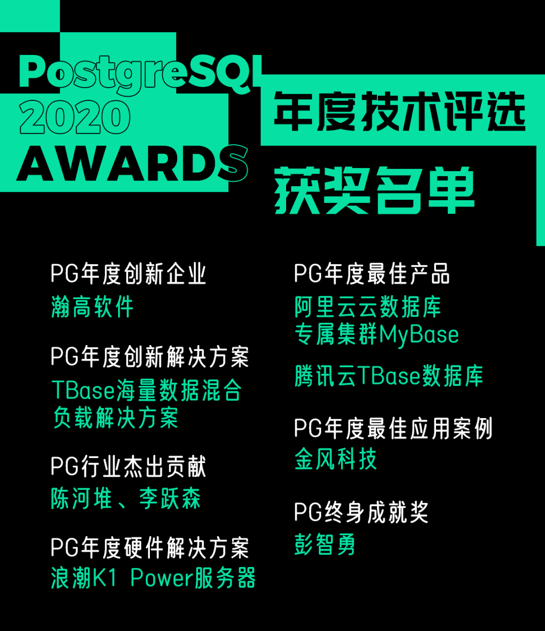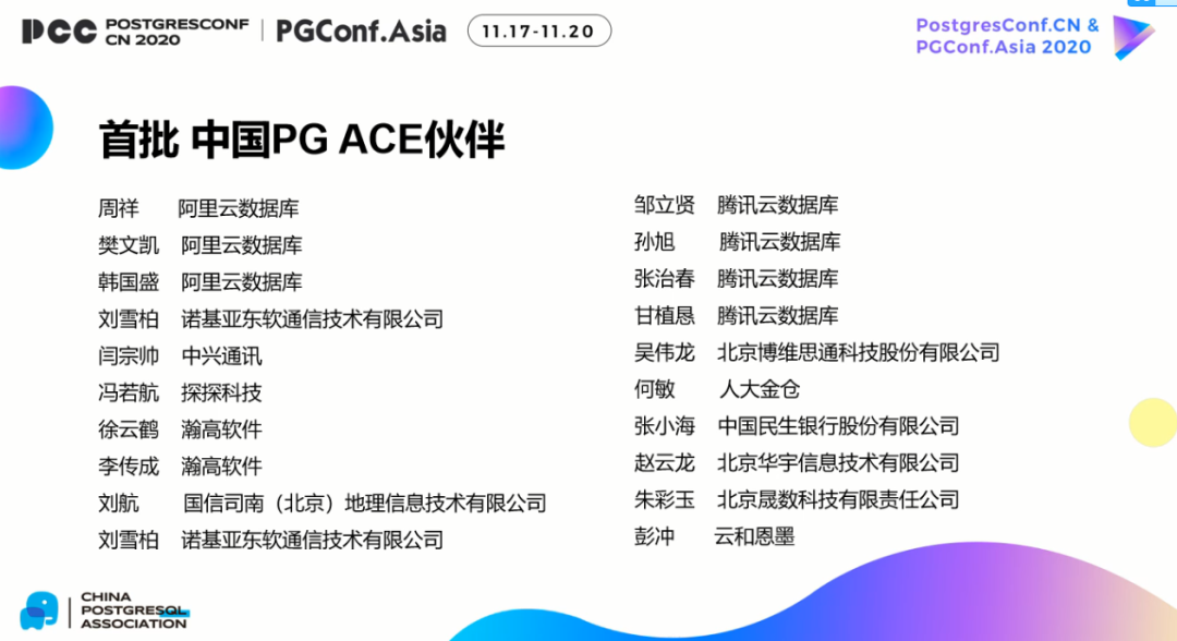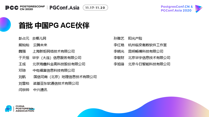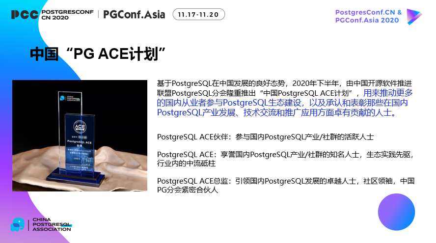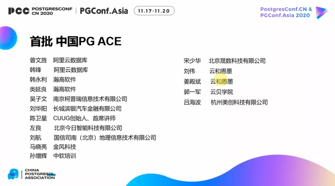 基于PostgreSQL在中国发展的良好态势,2020年下半年,由中国开源软件推进联盟PostgreSQL分会隆重推出“中国PostgreSQLACE计划”,用来推动更多的国内从业者参与PostgreSQL生态建设,以及承认和表彰那些在国内PostgreSQL产业发展、技术交流和推广应用方面卓有贡献的人士。