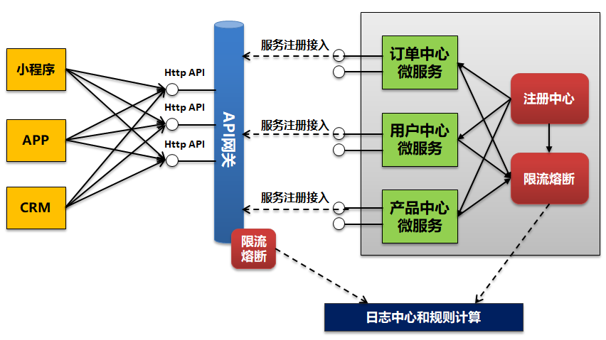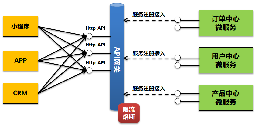有订单,用户和产品三个微服务暴露6个接口,其中3个属于内部使用走注册中心接入。另外三个接口注入接入到API网关,网关代理封装后暴露Http Rest接口提供外部小程序,APP和CRM三个独立的应用访问。
