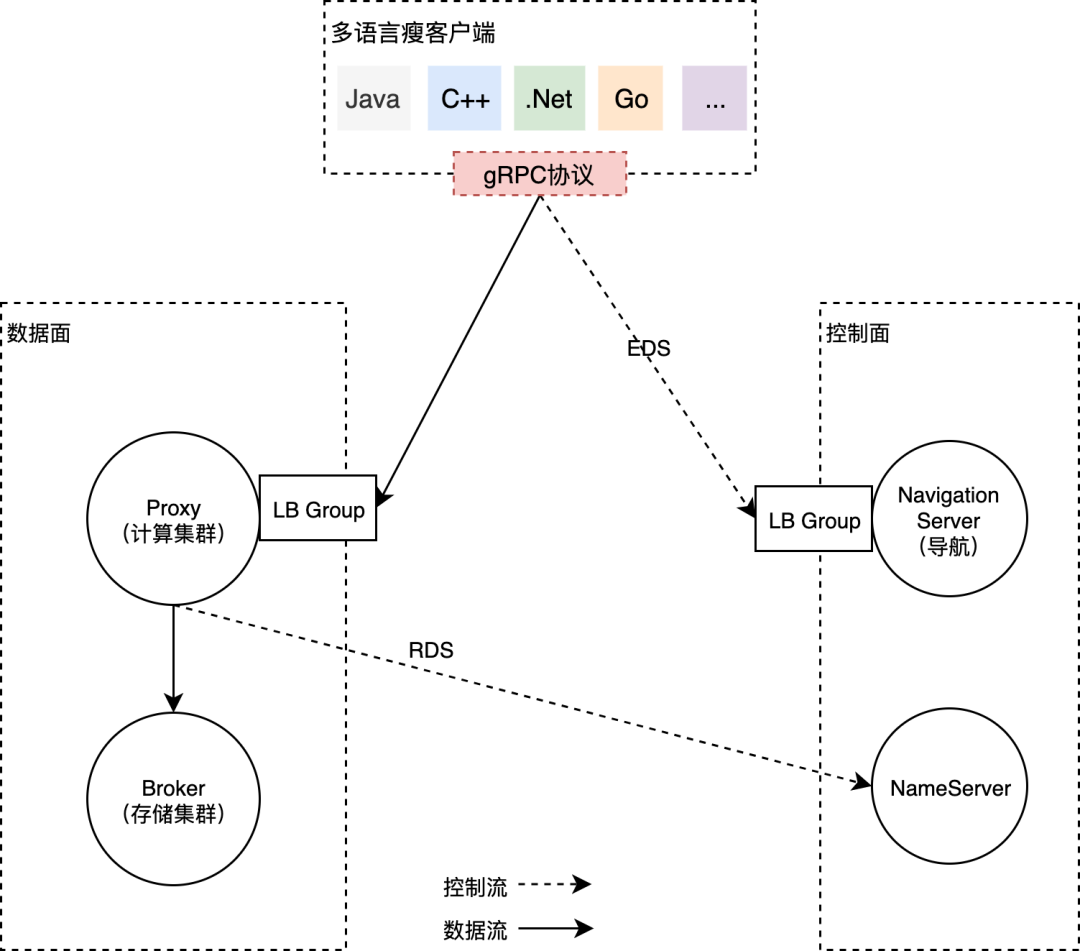 多语言瘦客户端,基于 gRPC 协议重新打造的一批多语言客户端,采取 gRPC 的主要考虑其在云原生时代的标准性、兼容性以及多语言传输层代码的生成能力。 导航服务(Navigation Server),通过 LB Group 暴露给客户端,客户端通过导航服务获取数据面的接入点信息(Endpoint),随后通过计算集群 Proxy 的 LB Group 进行消息的收发。通过 EDS 来暴露 Proxy 的接入点信息与通过 DNS 解析的负载均衡进行路由相比而言,可以作出更智能与更精细的租户及流量控制、负载均衡决策等。 NameServer,RocketMQ 中原有的核心组件,主要提供用于存储的 Broker 集群发现(CDS),存储单元 Topic 的路由发现(RDS)等,为运维控制台组件、用户控制台组件、计算集群 Proxy 提供 xDS 服务。 Proxy,重新研发的无状态计算集群,数据流量的入口,提供鉴权与签名、商业化计量、资源管理、客户端连接管理、消费者管控治理、客户端 RPC 处理、消息编解码处理、流量控制、多协议支持等。 Broker,原 Broker 模块的存储部分独立为新的存储节点,专注提供极具竞争力的高性能、低延迟的存储服务,存储计算分离后也更易加速存储能力的创新。原 Broker 模块的计算部分逐渐上移到 Proxy 集群当中。 LB Group,根据用户的需求提供 Classic VIP,VPC VIP,Internet VIP,Single Tunnel,PrivateLink 等多样化的接入能力。