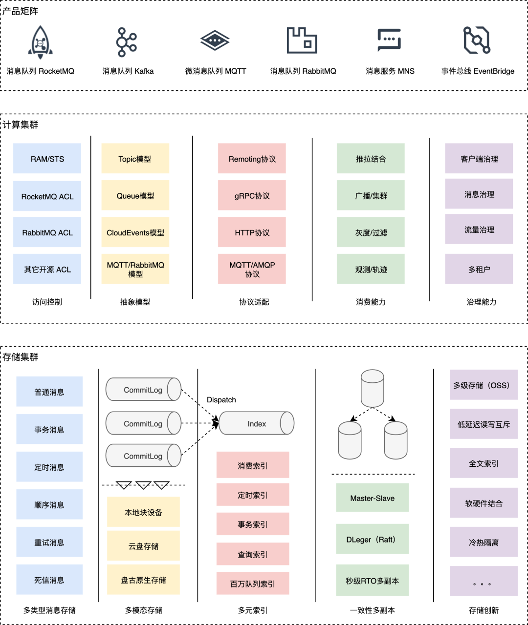 存储集群足够抽象,满足通用的消息存取需求。 计算集群多合一,足够的模块化,可插拔,满足多产品部署带来不同权限体系、不同协议、不同抽象模型等的需求。