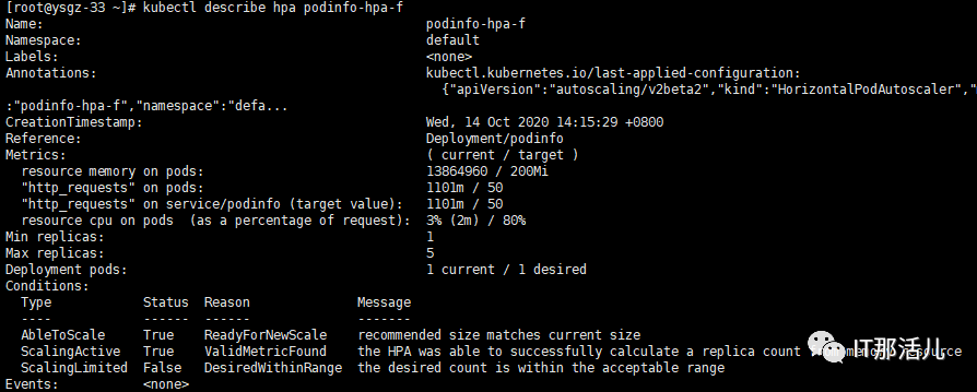 AbleToScale表明HPA是否可以获取和更新扩缩信息,以及是否存在阻止扩缩的各种回退条件。 ScalingActive表明HPA是否被启用(即目标的副本数量不为零)以及是否能够完成扩缩计算。当这一状态为False时,通常表明获取度量指标存在问题。 ScalingLimitted 表明所需扩缩的值被HPA所定义的最大或者最小值所限制。(即已经达到最大或者最小扩缩值)