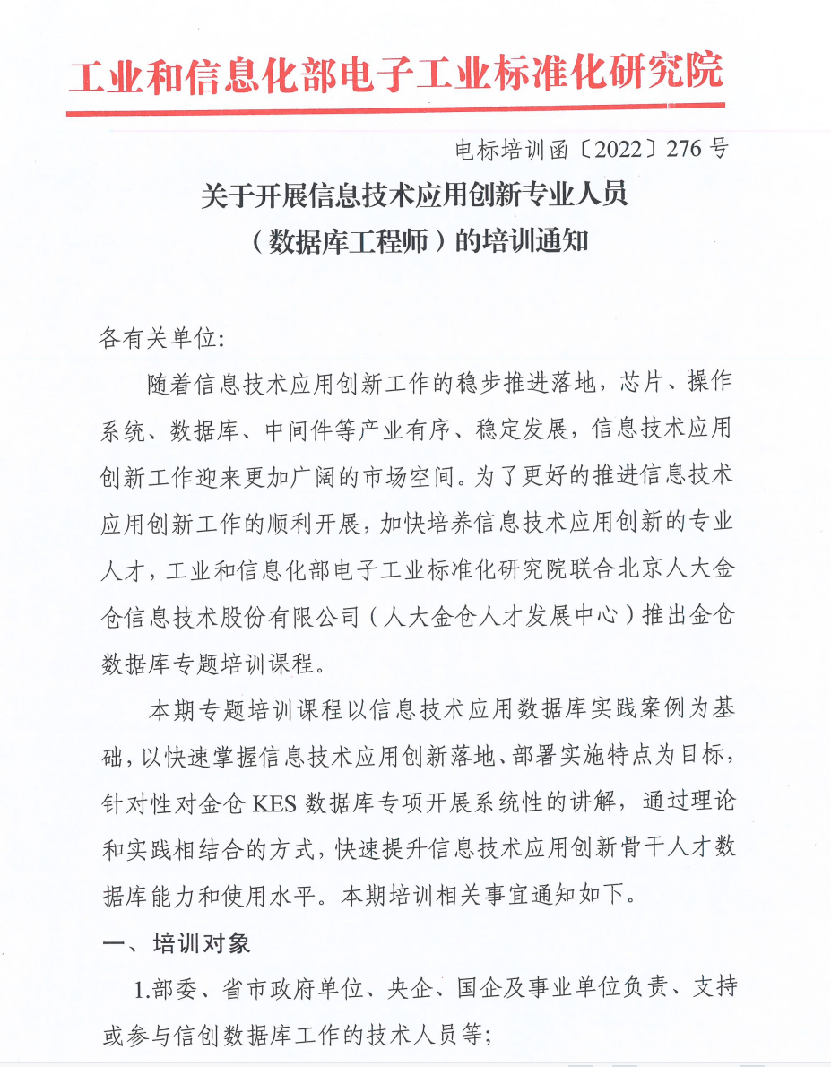 近期,电子标准院公布了电子信息领域人才培养合作单位名单,人大金仓凭借借自身丰富的人才培养实践经验和深厚的技术底蕴成功入选国产数据库合作企业。