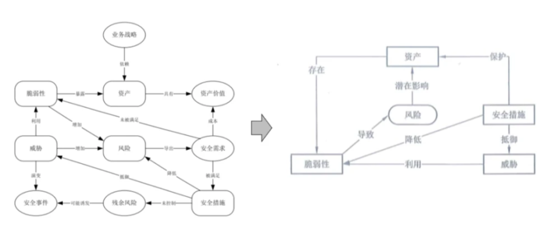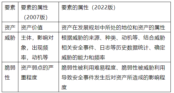 2007版和2022版的风险基本要素相同,均为资产、风险、安全措施、威胁和脆弱性。2022版简化了风险要素关系图,没有在图中体现业务战略、资产价值、安全需求、安全事件、残余风险等与风险基本要素相关的属性,如下图所示: