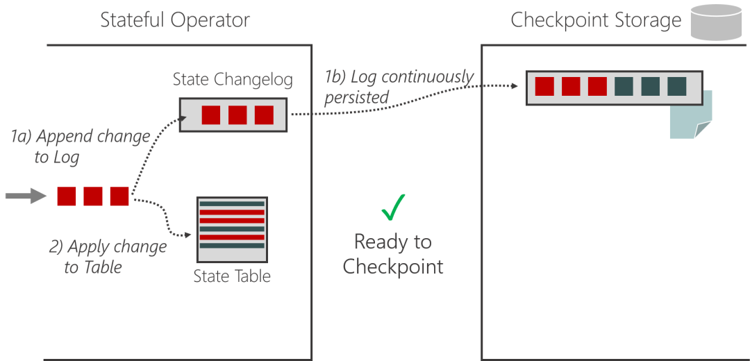 数据的增量更改(插入/更新/删除)会被写入到 Transaction Log 中。一旦这部分更改的日志被同步到持久存储中,我们就可以认为 Transaction 已经完成了。这个过程类似于上述方法中的 Checkpointing 的过程。 同时,为了方便数据查询,数据的更改也会异步持久化在数据表(Table)中。 一旦 Transaction Log 中的相关部分也在数据表中被持久化了,Transaction Log 中相关部分就可以删除了。这个过程类似于我们方法中的 State Table 持久化过程。