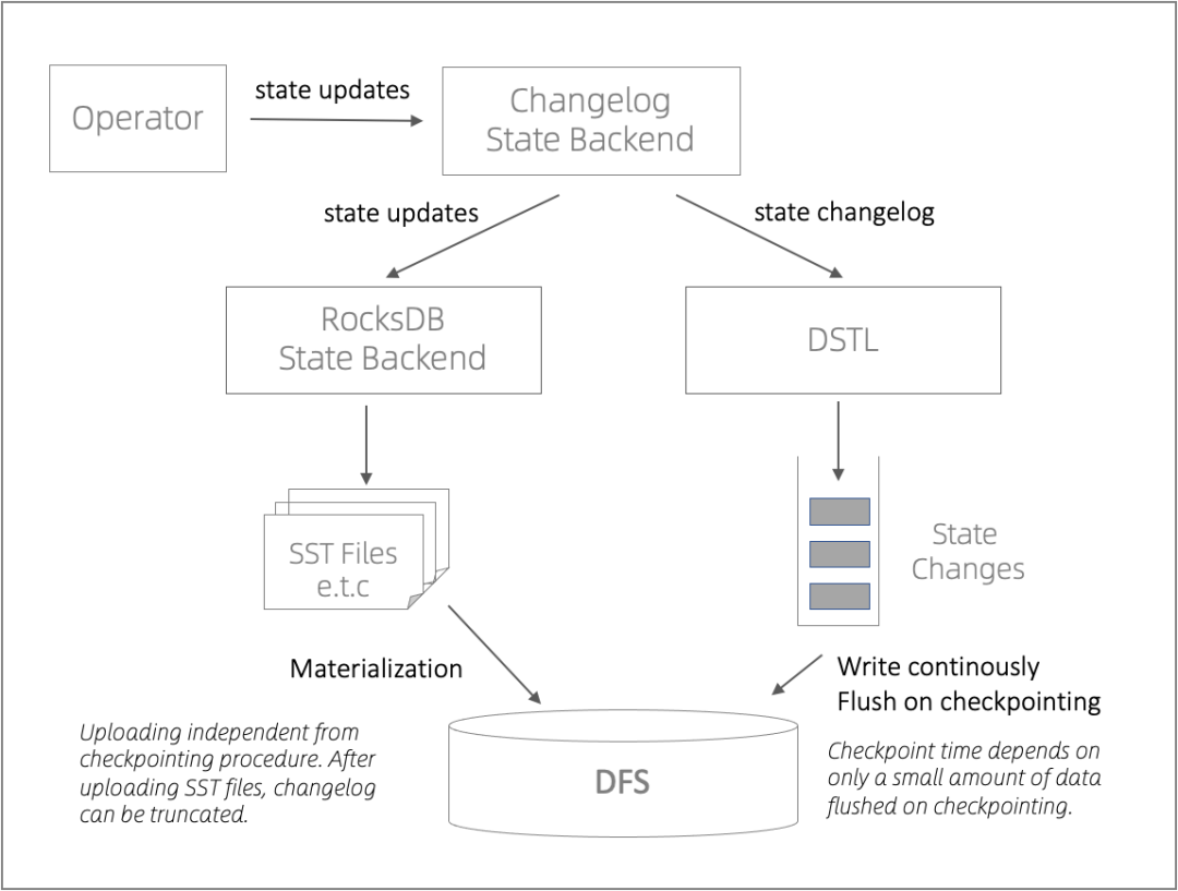 算子在更新状态的时候写双份,一份更新写入状态表 State Table 中,一份增量写入 State Changelog 中。 Checkpoint 变成由两个部分组成,第一个部分是当前已经持久化的存在远端存储上的 State Table,第二个部分是增量的 State Changelog。 State Table 的持久化和 Checkpointing 过程独立开来,会定期由 background thread 持久化,我们称为 Materialization(物化)的过程。 在做 Checkpoint 的时候,只要保证新增的 State Changelog 被持久化就可以了。