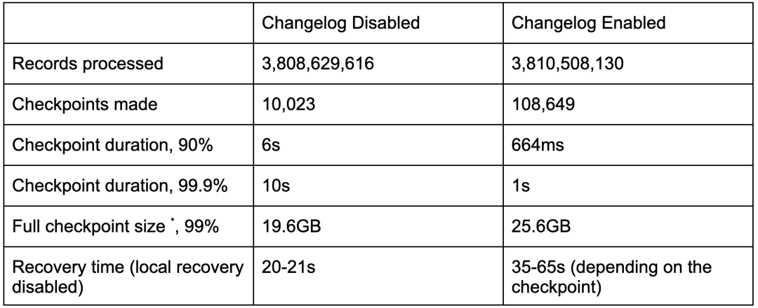 表3: 基于 Window Workload 的 Changelog(开启/关闭)的 Checkpoint 相关指标对比