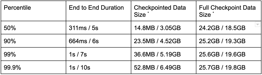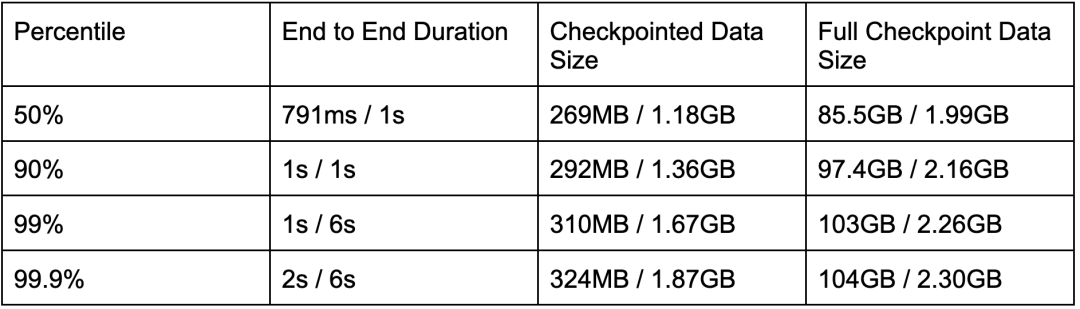 Checkpointed Data Size 是指在收到 Checkpoint Barrier,Checkpointing 过程开始后上传数据的大小。对于 Changelog 来说,大部分数据在 Checkpointing 过程开始前就已经上传了,所以这就是为什么开启 Changelog 时这个指标要比关闭时小得多的原因。 Full Checkpoint Data Size 是构成 Checkpoint 的所有文件的总大小,也包括与之前 Checkpoint 共享的文件。与通常的 Checkpoint 相比,Changelog 的格式没有被压缩过也不够紧凑,因此占用更多空间。