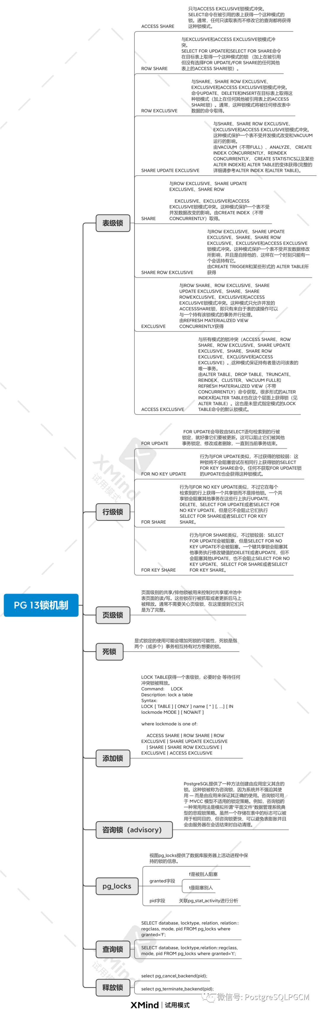 一个SQLwitht_wait as(select a.mode,a.locktype,a.database,a.relation,a.page,a.tuple,a.classid,a.granted,a.objid,a.objsubid,a.pid,a.virtualtransaction,a.virtualxid,a.transactionid,a.fastpath,b.state,b.query,b.xact_start,b.query_start,b.usename,b.datname,b.client_addr,b.client_port,b.application_namefrom pg_locks a,pg_stat_activity b where a.pid=b.pid and not a.granted),t_run as(select a.mode,a.locktype,a.database,a.relation,a.page,a.tuple,a.classid,a.granted,a.objid,a.objsubid,a.pid,a.virtualtransaction,a.virtualxid,a.transactionid,a.fastpath,b.state,b.query,b.xact_start,b.query_start,b.usename,b.datname,b.client_addr,b.client_port,b.application_namefrom pg_locks a,pg_stat_activity b where a.pid=b.pid and a.granted),t_overlap as(select r.* from t_wait w join t_run r on(r.locktype is not distinct from w.locktype andr.database is not distinct from w.database andr.relation is not distinct from w.relation andr.page is not distinct from w.page andr.tuple is not distinct from w.tuple andr.virtualxid is not distinct from w.virtualxid andr.transactionid is not distinct from w.transactionid andr.classid is not distinct from w.classid andr.objid is not distinct from w.objid andr.objsubid is not distinct from w.objsubid andr.pid <> w.pid)),t_unionall as(select r.* from t_overlap runion allselect w.* from t_wait w)select locktype,datname,relation::regclass,page,tuple,virtualxid,transactionid::text,classid::regclass,objid,objsubid,string_agg('Pid: '||case when pid is null then 'NULL' else pid::text end||chr(10)||'Lock_Granted: '||case when granted is null then 'NULL' else granted::text end||' , Mode: '||case when mode is null then 'NULL' else mode::text end||' , FastPath: '||case when fastpath is null then 'NULL' else fastpath::text end||' , VirtualTransaction: '||case when virtualtransaction is null then 'NULL' else virtualtransaction::text end||' , Session_State: '||case when state is null then 'NULL' else state::text end||chr(10)||'Username: '||case when usename is null then 'NULL' else usename::text end||' , Database: '||case when datname is null then 'NULL' else datname::text end||' , Client_Addr: '||case when client_addr is null then 'NULL' else client_addr::text end||' , Client_Port: '||case when client_port is null then 'NULL' else client_port::text end||' , Application_Name: '||case when application_name is null then 'NULL' else application_name::text end||chr(10)||'Xact_Start: '||case when xact_start is null then 'NULL' else xact_start::text end||' , Query_Start: '||case when query_start is null then 'NULL' else query_start::text end||' , Xact_Elapse: '||case when (now()-xact_start) is null then 'NULL' else (now()-xact_start)::text end||' , Query_Elapse: '||case when (now()-query_start) is null then 'NULL' else (now()-query_start)::text end||chr(10)||'SQL (Current SQL in Transaction): '||chr(10)||case when query is null then 'NULL' else query::text end,chr(10)||'--------'||chr(10)order by( case modewhen 'INVALID' then 0when 'AccessShareLock' then 1when 'RowShareLock' then 2when 'RowExclusiveLock' then 3when 'ShareUpdateExclusiveLock' then 4when 'ShareLock' then 5when 'ShareRowExclusiveLock' then 6when 'ExclusiveLock' then 7when 'AccessExclusiveLock' then 8else 0end ) desc,(case when granted then 0 else 1 end)) as lock_conflictfrom t_unionallgroup bylocktype,datname,relation,page,tuple,virtualxid,transactionid::text,classid,objid,objsubid ;