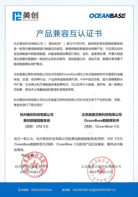 近日,杭州美创科技有限公司(简称:美创科技)与北京奥星贝斯科技有限公司(简称:OceanBase)顺利完成产品兼容性互认证。测试结果表明:美创数据脱敏系统与OceanBase数据库完全兼容,系统功能运行稳定,性能卓越。
