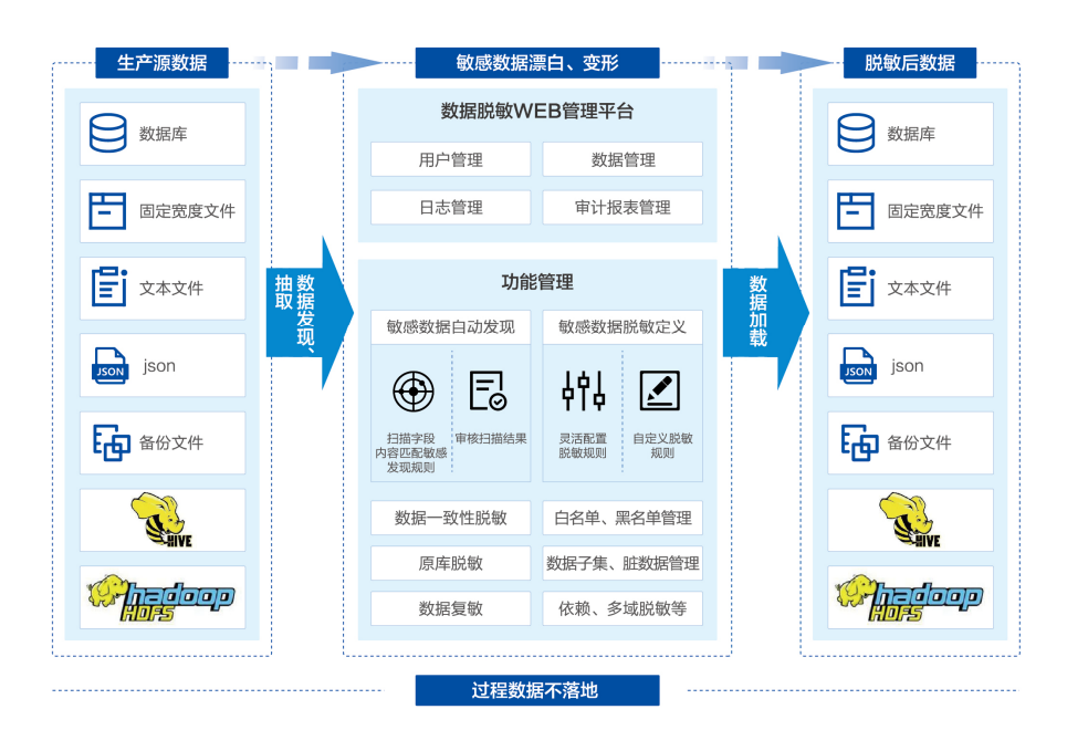 业务系统在线动态脱敏、脏数据识别及处理机制、支持大数据异构数据源脱敏、支持脱敏作业记录级别的断点续传、支持数据库之间的对象同步。