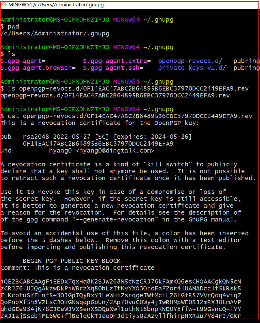 $ gpg --list-keysgpg: checking the trustdbgpg: marginals needed: 3 completes needed: 1 trust model: pgpgpg: depth: 0 valid: 1 signed: 0 trust: 0-, 0q, 0n, 0m, 0f, 1ugpg: next trustdb check due at 2024-05-26/c/Users/Administrator/.gnupg/pubring.kbx-----------------------------------------pub rsa2048 2022-05-27 [SC] [expires: 2024-05-26]0F14EAC47ABC2B64895B6EBC37970DCC2449EFA9uid [ultimate] hyang0 <hyang0@dingtalk.com>sub rsa2048 2022-05-27 [E] [expires: 2024-05-26]Administrator@MS-OIPXDHWZIYJO MINGW64 ~/.gnupg$ gpg --list-secret-keys/c/Users/Administrator/.gnupg/pubring.kbx-----------------------------------------sec rsa2048 2022-05-27 [SC] [expires: 2024-05-26]0F14EAC47ABC2B64895B6EBC37970DCC2449EFA9uid [ultimate] hyang0 <hyang0@dingtalk.com>ssb rsa2048 2022-05-27 [E] [expires: 2024-05-26]Administrator@MS-OIPXDHWZIYJO MINGW64 ~/.gnupg$ find../openpgp-revocs.d./openpgp-revocs.d/0F14EAC47ABC2B64895B6EBC37970DCC2449EFA9.rev./private-keys-v1.d./private-keys-v1.d/B05AE222221AF5FD5C702C5A9B2C18F27822F0FE.key./private-keys-v1.d/BC5A93F2F569E12AE420EDE4D36414175795F2CC.key./pubring.kbx./pubring.kbx~./S.gpg-agent./S.gpg-agent.browser./S.gpg-agent.extra./S.gpg-agent.ssh./trustdb.gpg