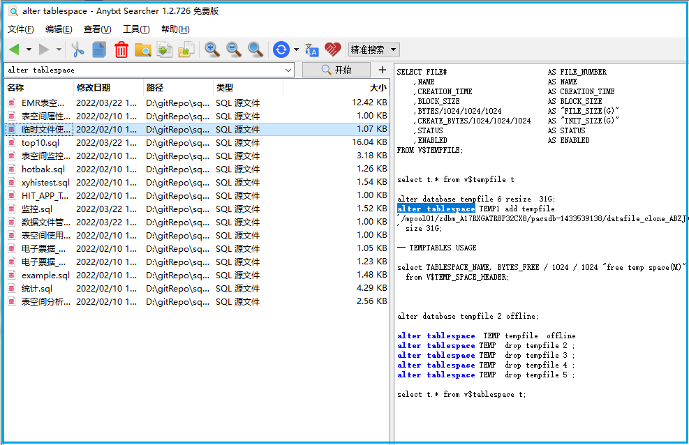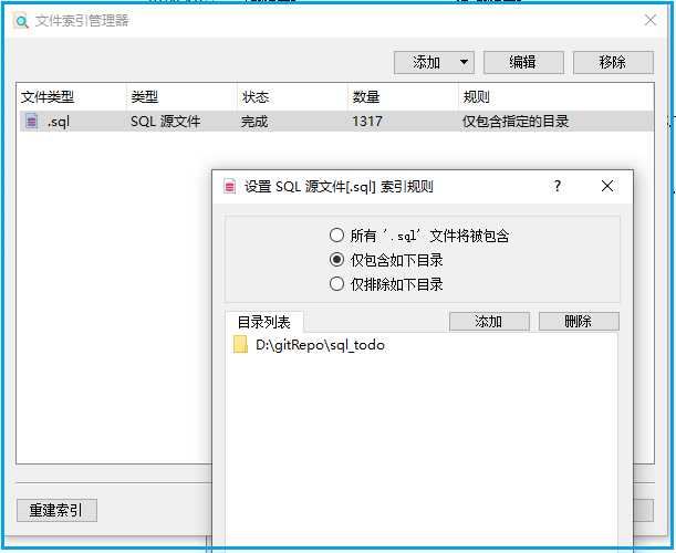 程序默认会对硬盘中的所有文档后缀(.pdf .docx .txt)的文件进行扫描,生成全文本索引。如果想只对指定目录和特定文件后缀的文件生成索引,可以重建索引。比如我只添加了一个SQL目录,用来索引用过的SQL脚本: