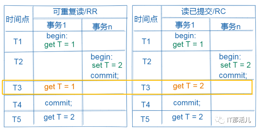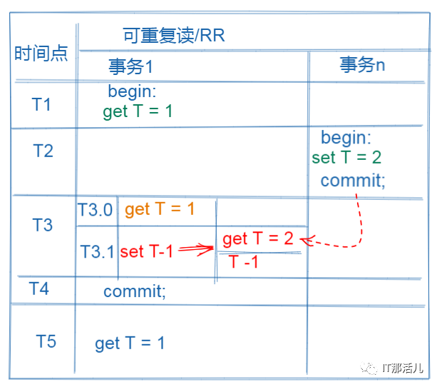 也就是说对于可重复读级别而言快照以事务开始时间为准,读已提交级别下每条SQL语句启动时重新获取当前数据库的快照以便获取最新已提交的事务情况。这里可能有些同学会有疑问,在RR级别下,T3时刻将T减1是不是意味着T2时刻的事务变更会丢失?针对这个问题,数据库引擎当然没有那么小白,这里适用一条新的规则, 发生DML时,需要读取已提交事务的最新值,这个读一般称为"当前读"(current read)。案例中也就是T3发起set DML时需要获取已提交的最新值也就是T=2后,再进行运算,这就不存在事务丢失的风险了,需要注意如果事务n进行了修改但是没有提交,这里事务1就会产生行锁等待,这里我们就不再展开介绍了。