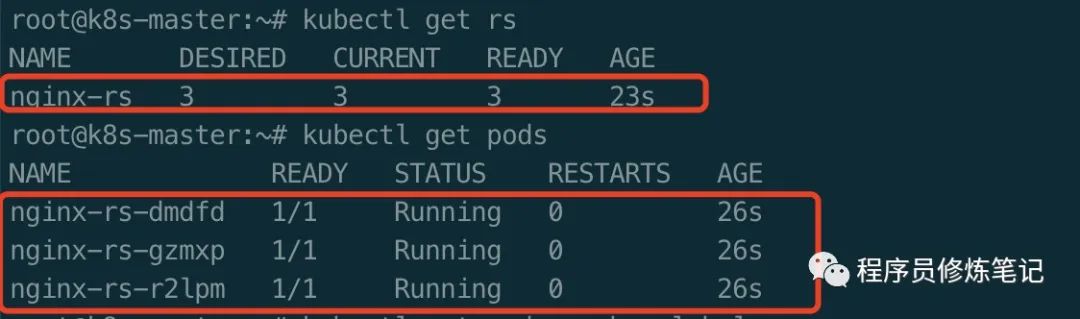 NAME:ReplicaSet的名字 DESIRED:应用期望的副本数 CURRENT:处于运行状态的副本数 READY:可以为用户提供服务的副本数 AGE:应用已经运行的时间