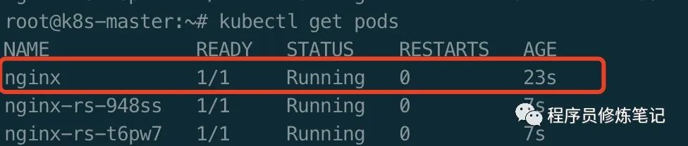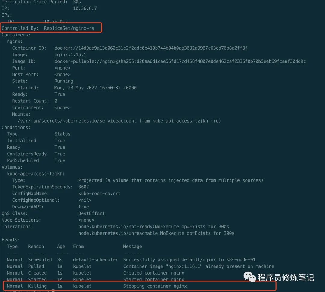 从上图可以看出我们手动创建的nginx pod成功被RS获取到,并且被kill掉。