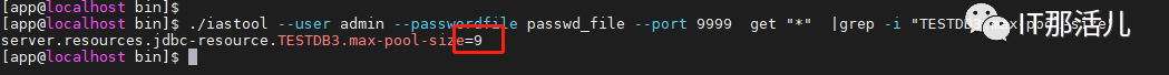 9999 get "*" |grep -i "TESTDB3.max-pool-size"