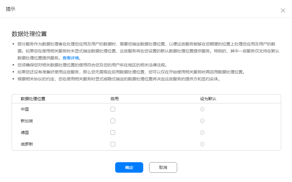 (可选)如您还未选择数据处理位置,需要您先设置数据处理位置,具体操作请参见设置数据处理位置。