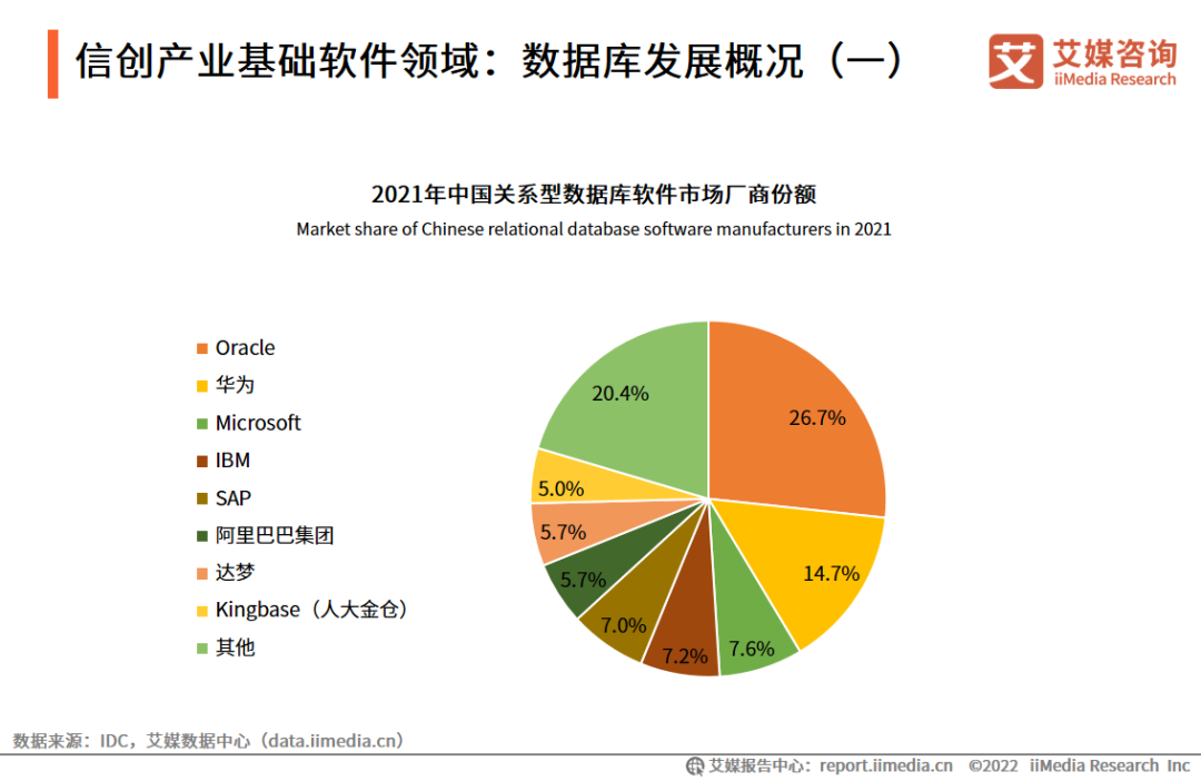 国外厂商仍然占据中国数据库市场份额超过50%,仅Oracle、IBM和微软三家厂商占据市场份额超40%,其中Oracle占据了关系型数据库市场近30%的份额。