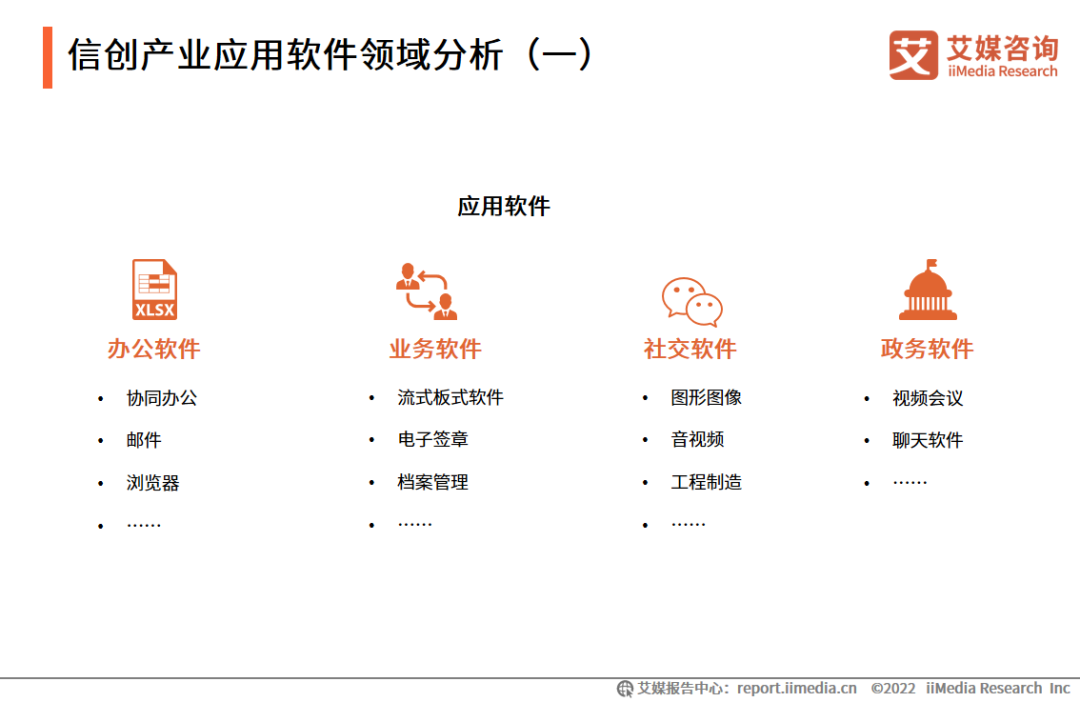 作为贴近客户的使用端,信创生态下应用软件的性能、功能、兼容性、稳定性等条件是否能够满足工作需求。中国应用软件产业整体发展较为成熟,在信创领域也相对拥有较为丰富的产品供给,整体国产化程度较高。