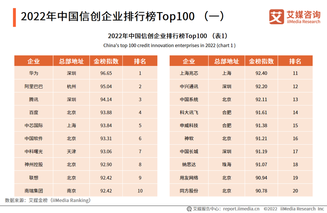 在iiMedia Ranking艾媒金榜发布的《2022年中国信创企业Top100》中,华为(96.65)、阿里巴巴(95.04)、腾讯(94.14)依次位列前三名。