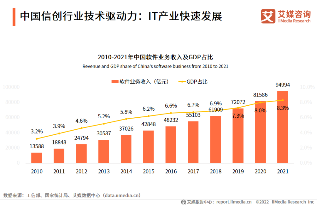 数据显示,中国软件业务的收入持续增加,2021年达94994亿元。软件业务市场收入规模始终保持高速增长,为信创产业提供良好的发展基础。