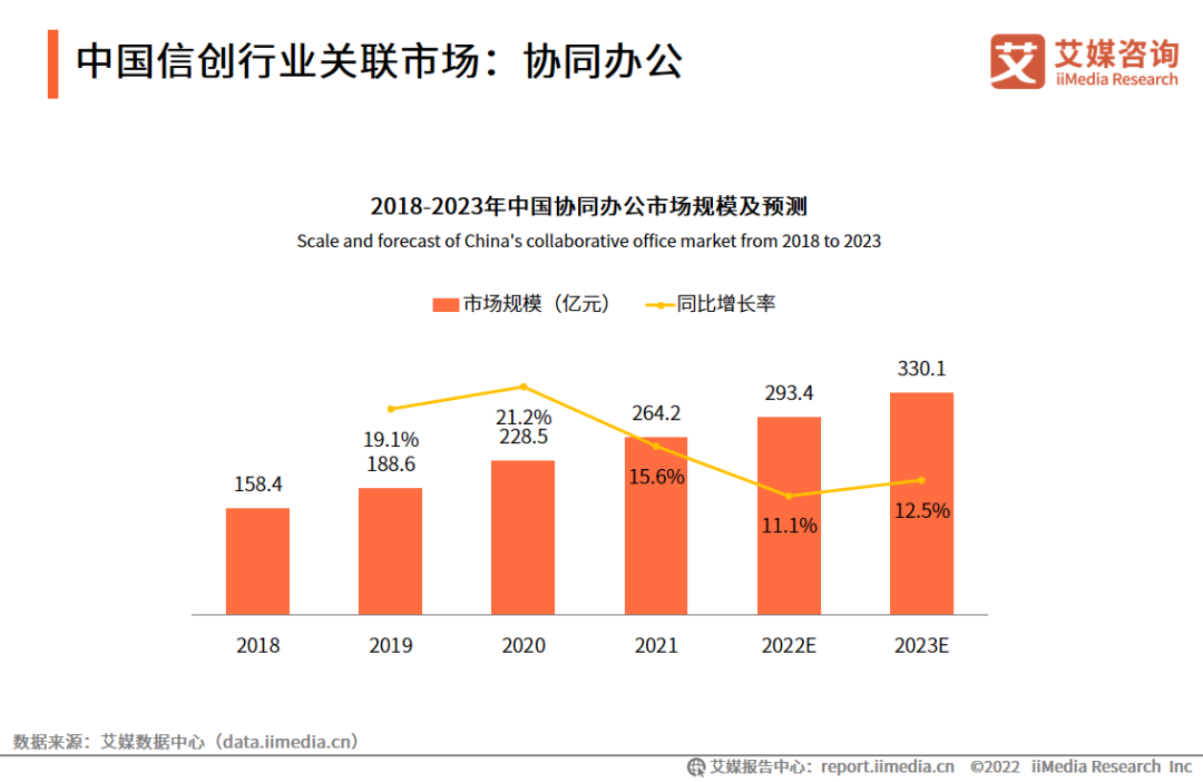 预计2022-2023年中国协同办公行业将保持每年10%以上的增长率,2023年的市场规模将达330.1亿元。
