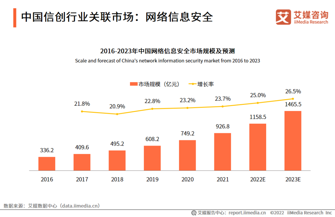 数据显示,2021年中国网络信息安全市场规模接近1千亿元,预计2023年将达1465.5亿元。