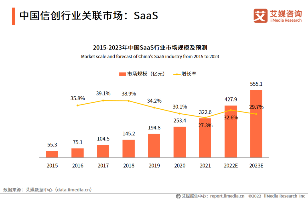 数据显示,2021年中国SaaS行业市场规模达322.6亿元,预计2023年将达555.1亿元。