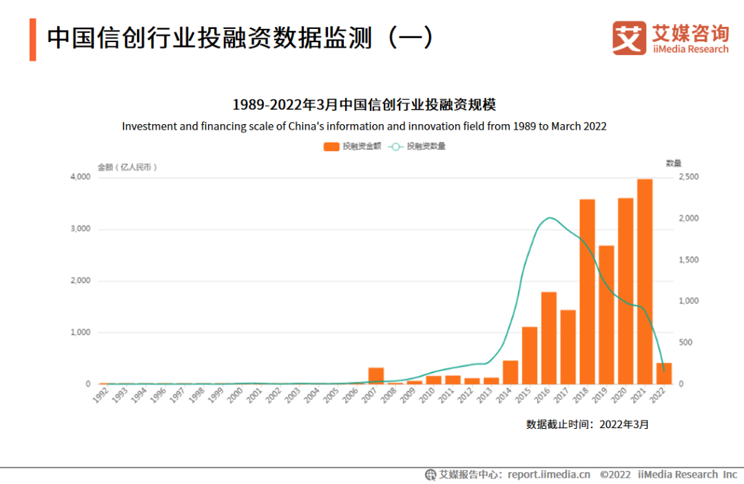 数据显示,2021年中国信创行业投融资金额达到历年来最高值,达3970.25亿人民币,投融资数量达885起,行业势头较好。