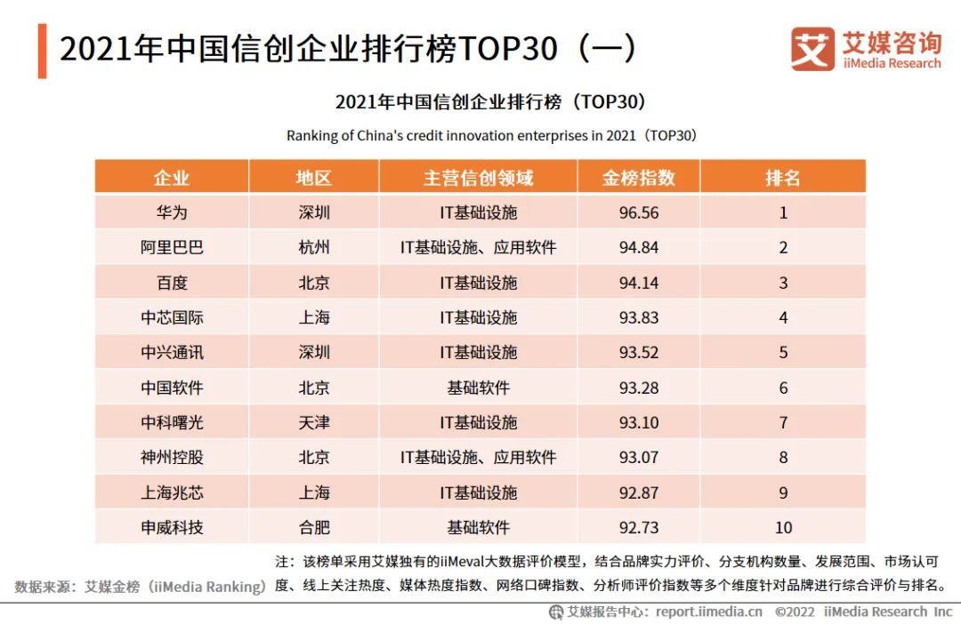 在iiMedia Ranking艾媒金榜最新发布的“2021年中国信创企业排行榜Top30 ”中,前三十名企业覆盖领域主要以IT基础设施为主。榜单以多个维度针对品牌进行综合评价与排名,华为以96.56的金榜指数排行第一,综合实力较强。阿里巴巴和百度分别以94.84 、94.14,位列第二、三名。